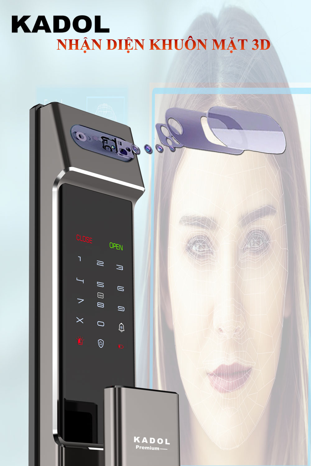 Khóa cửa nhận diện khuôn mặt 3D Kadol KD-M100F: là một trong những mẫu khóa thuộc dòng sản phẩm cao cấp bán chạy nhất hiện nay. Khóa bảo mật bằng khuôn mặt, vân tay, thẻ từ, mã số, chìa cơ.