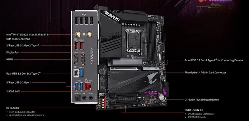 Z790 AORUS ELITE AX được trang bị đẩy đủ các cổng kết nối để bạn dễ dàng lắp đặt.