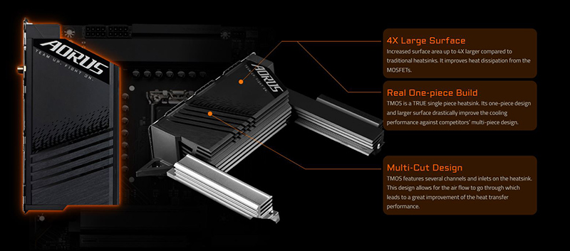 Main Z790 AORUS ELITE AX với diện tích bề mặt lớn hơn so với tản nhiệt truyền thống giúp cải thiện khả năng tản nhiệt từ MOSFET. |
